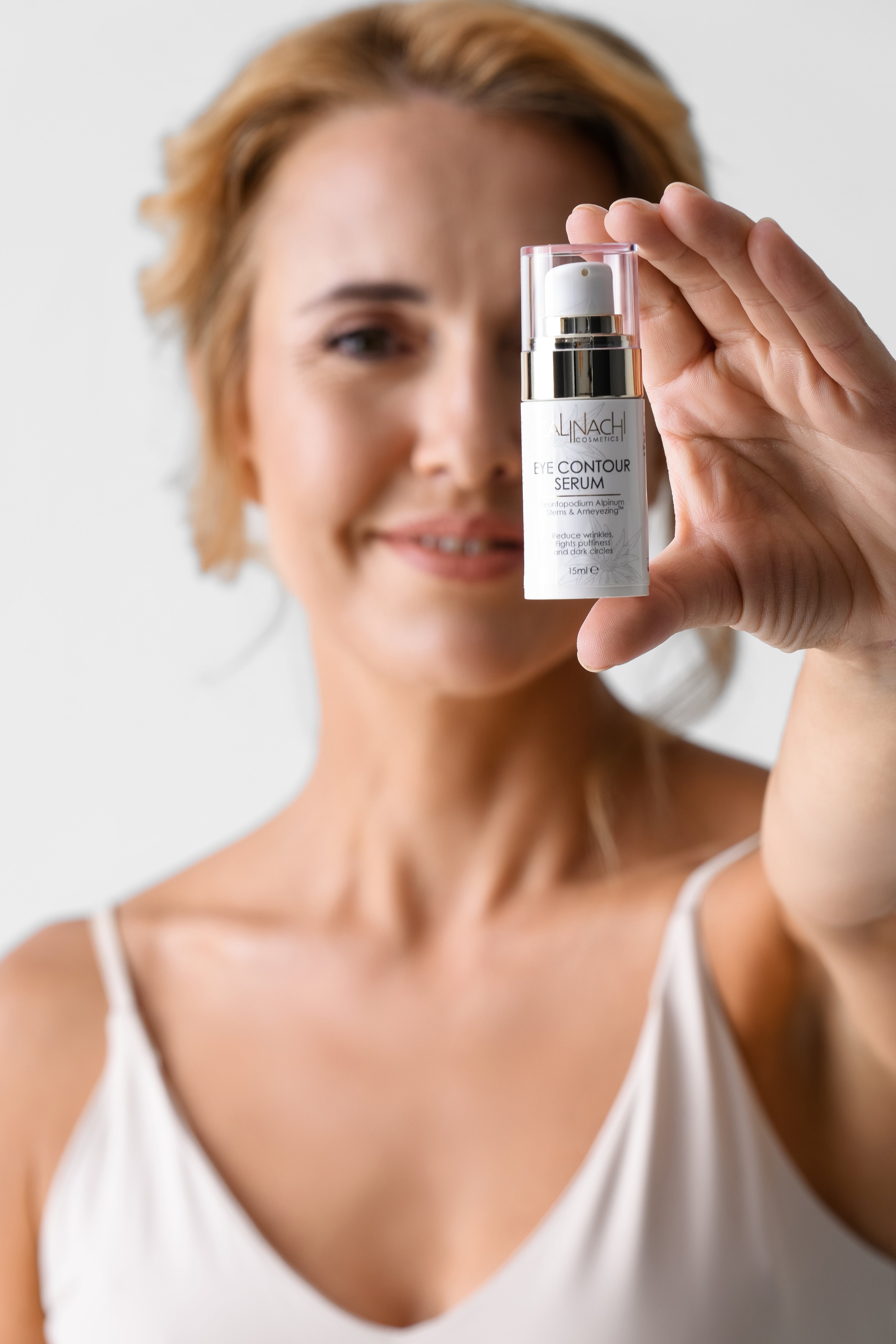 Das Calinachi Augenkonturserum sorgt für sichtbar strahlende, intensive Feuchtigkeitspflege und reduziert Falten in einer leichten Formel. Mit den Wirkstoffen Sens'Hyal™ , Ameyezing™ und Leontopod Stems GX™ bekämpft es Augenringe, Schwellungen und feine Linien für einen erholten, frischen Blick.
